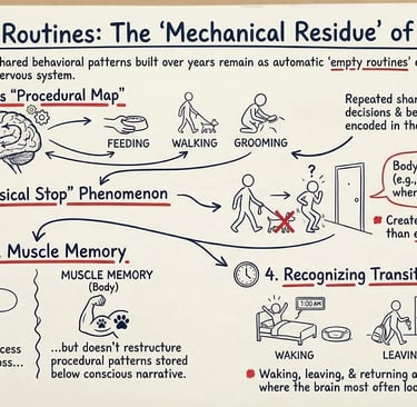This means the empty routine problem rarely gets named in the support a person receives. People focus on the grief. They don't focus on the behavioral residue that keeps recycling it. The person is left managing something they can't articulate clearly, because the cultural framework for pet loss grief doesn't make room for procedural memory as a distinct and addressable problem.
