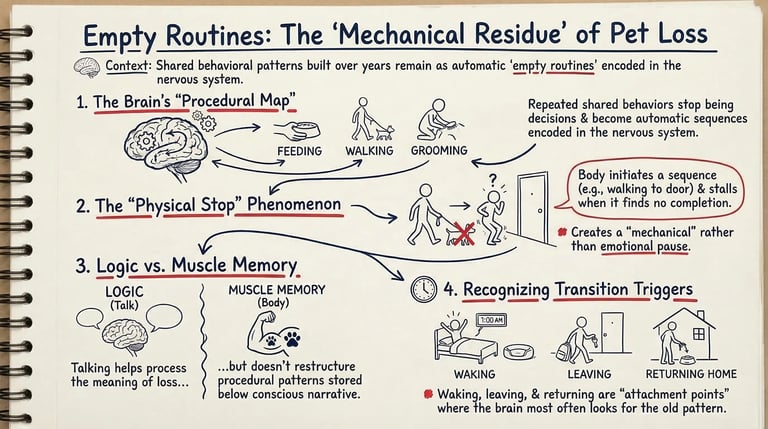 When your pet dies, the routines you shared don't disappear. They stay, empty. Here's what's actually happening and why it persists.