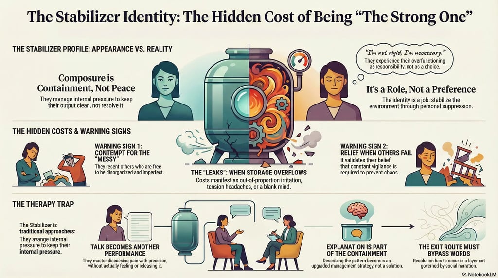 The stabilizer identity also tends to come with a specific kind of fatigue: not tiredness, but saturation. The mind is full of unfinished internal movements that never complete because completion would require disorganization. The body carries the remainder. The person becomes “fine” in ways that are increasingly expensive.