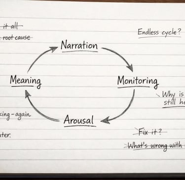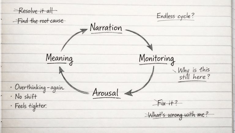 Rumination is not just “thinking a lot.” It’s repetitive cognition with no new behavioural options generated. It’s a closed circuit. It often carries the emotional tone of problem-solving, but it doesn’t produce solutions. It produces tighter identification with the problem.